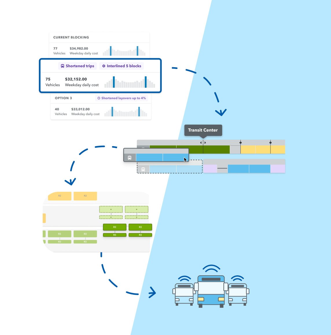 Align blocks with driver shifts to minimize unnecessary overtime, deadhead miles, and labor inefficiencies. Create what-if scenarios to help you reduce cost and risk. And add range settings to garages and vehicle types (including EVs!) to understand how different vehicle ranges will impact your blocking.
