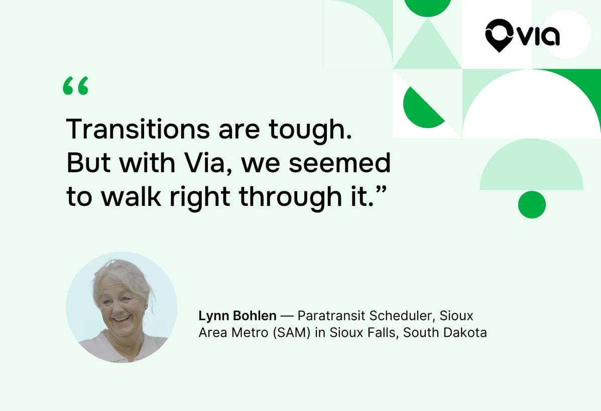 Meet Lynn Bohlen, a 20-year transit operations veteran working as a paratransit scheduler with Sioux Area Metro (SAM) in Sioux Falls, South Dakota. Scheduling was so taxing with SAM’s previous vendor that Lynn began looking for another job — until SAM transitioned to Via. “I think it’s a lot more efficient, I really do. I think it’s great,” says Lynn after the transition. “I hit optimize, and it scheduled every ride.”